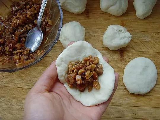 【5】把小面團(tuán)搟成圓形,翻面包入叉燒餡,封口收緊,放在烤盤(pán)上進(jìn)行最后發(fā)酵。