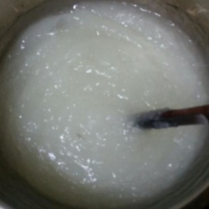 2、剩下的500g水燒開后轉(zhuǎn)小火,把第一步的混合液體緩慢倒入,邊倒邊快速攪拌,直到鍋中的液體相對(duì)固化并成透明狀。