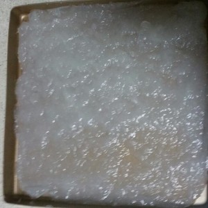 3、倒入不粘盤里,我是用我的金烤盤放的,如果沒有就普通盤子刷點(diǎn)油放在盤子里就好,冷卻后放冰箱冷藏2-4小時(shí)后拿出調(diào)味。