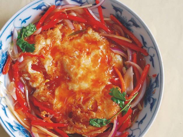 7、把炒好的五柳絲,配上五柳汁,倒在炸蛋上,一份色香味俱全的玉淀粉酸甜五柳蛋就做好了。