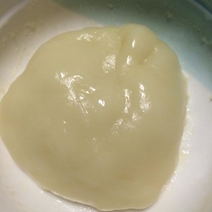 接下來做雪媚娘的皮:糖用熱水化開后拌入牛奶中,再加入到糯米粉和玉米淀粉中,攪拌面糊。